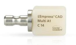 IPS Empress CAD Multi aihiot. Käyttöindikaatiot: osa- ja kokokruunut sekä laminaatit. Valittavana viisi V-väriä (A1, A2, A3, A3,5, B1) ja kaksi bleach-väriä (BL1, BL3) sekä kolme kokoa (I12, C14, C14L).