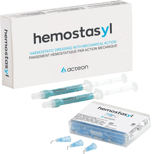 Hemostasyl är en blodstillande gel för applicering på alla moderata blödningar som kan uppkomma inom daglig tandvård. Innehåll: 2 sprutor à 2g